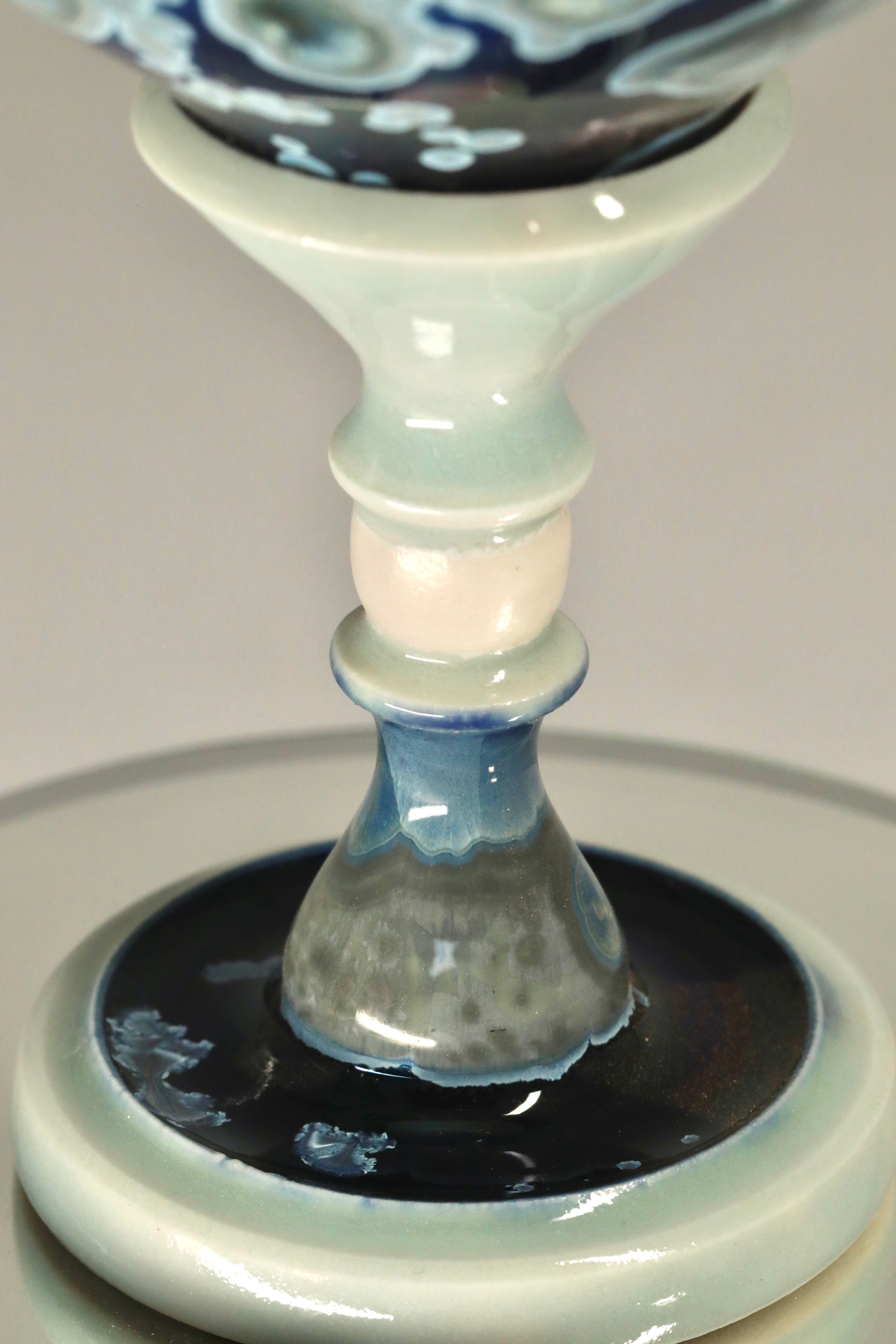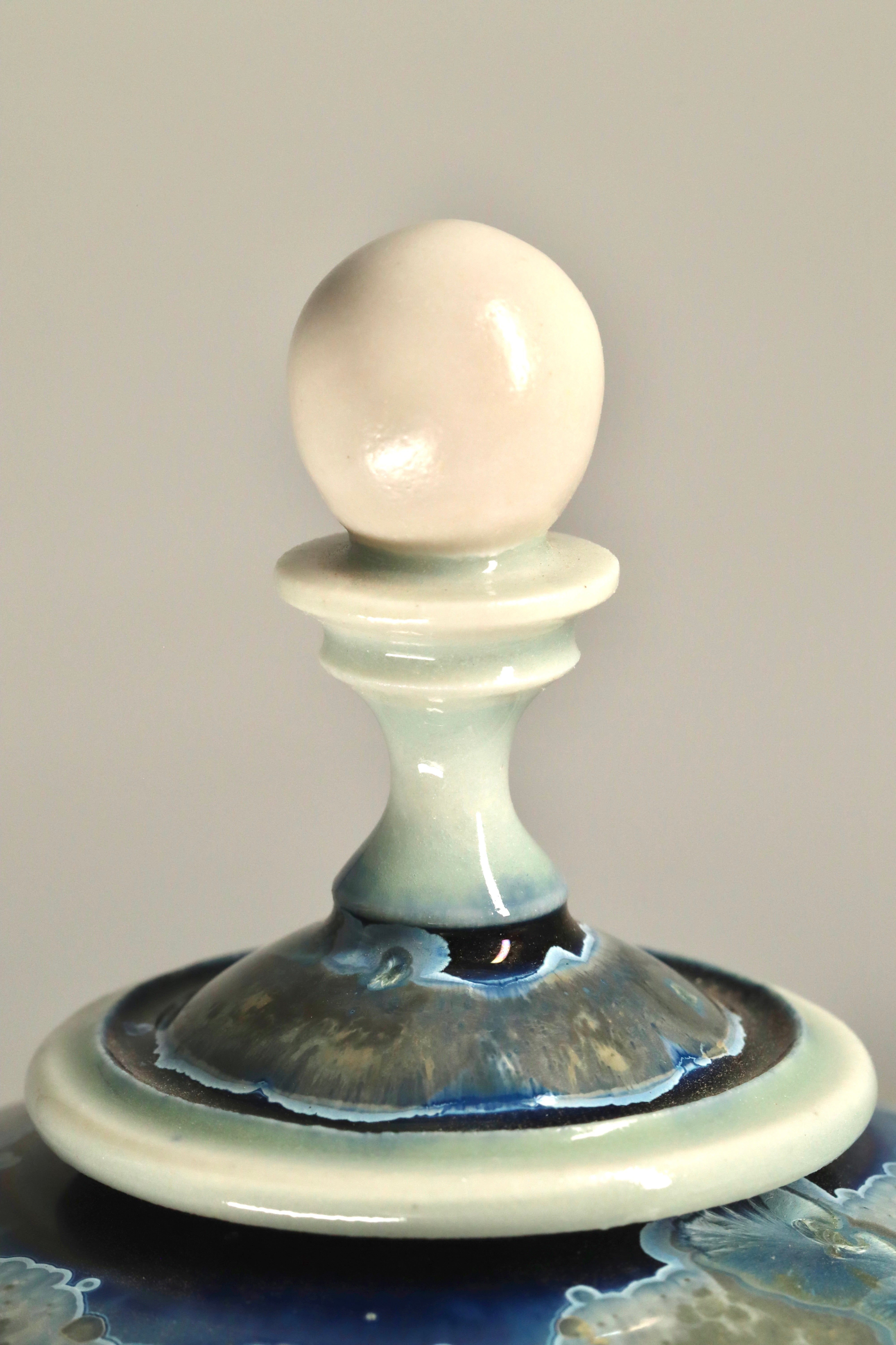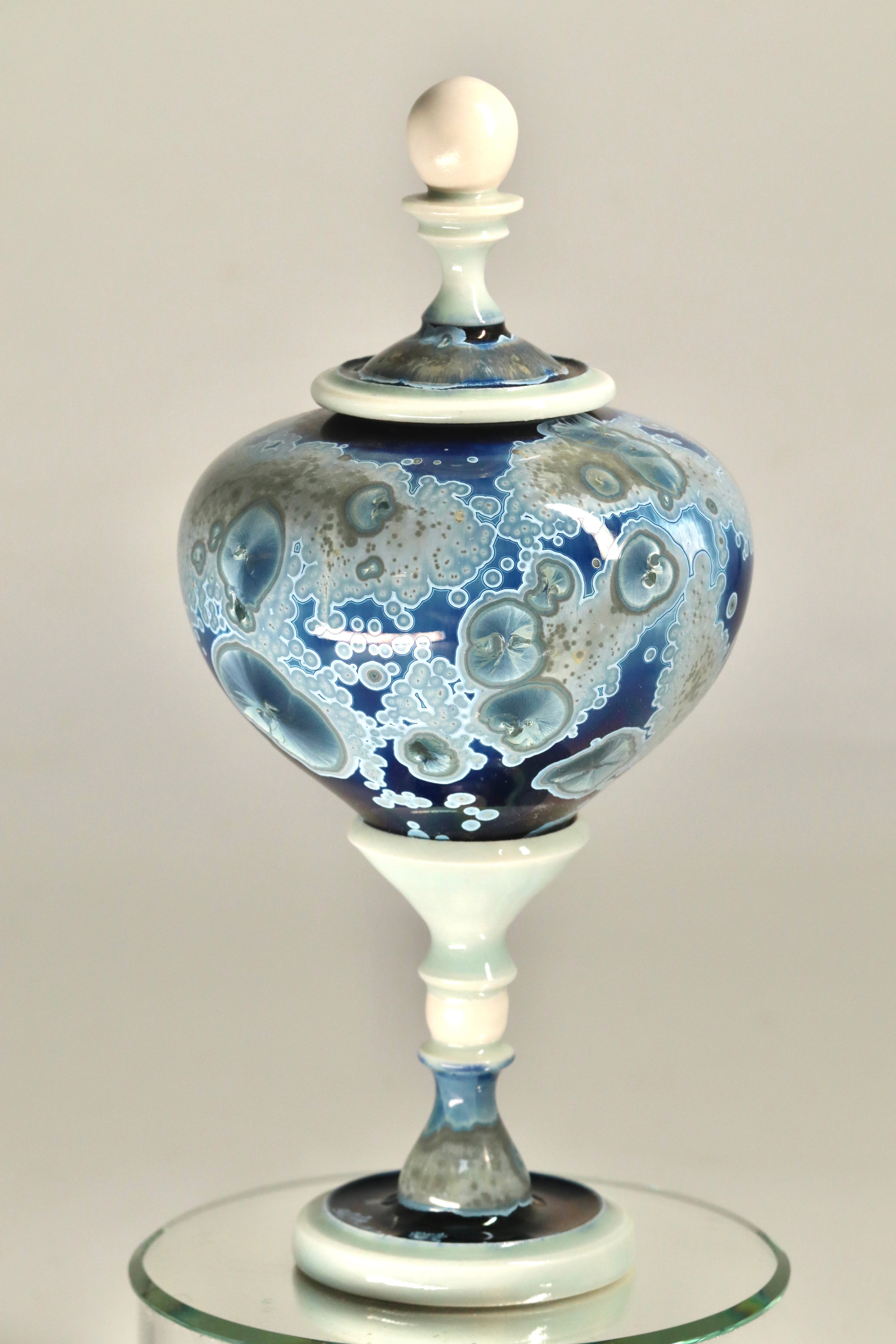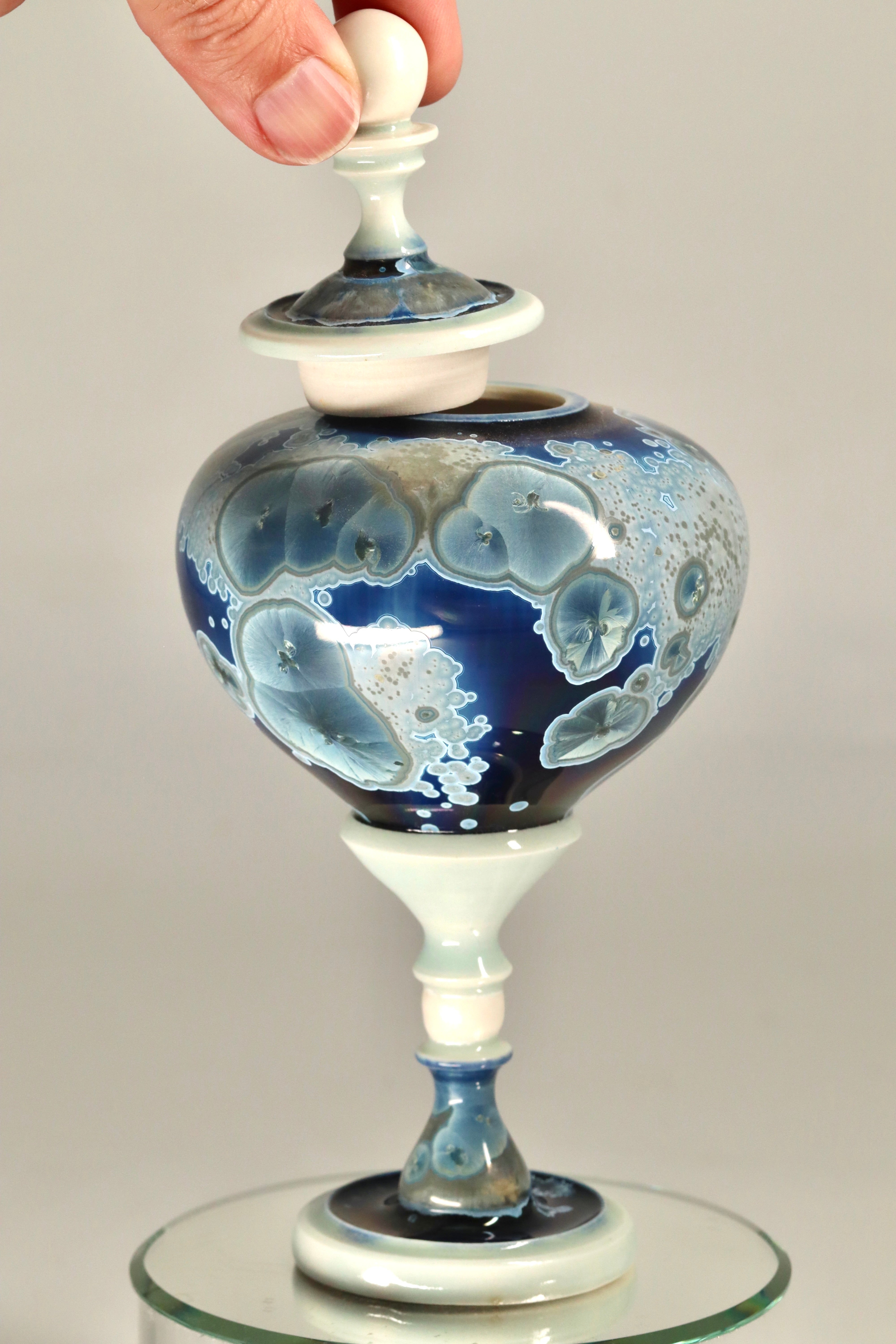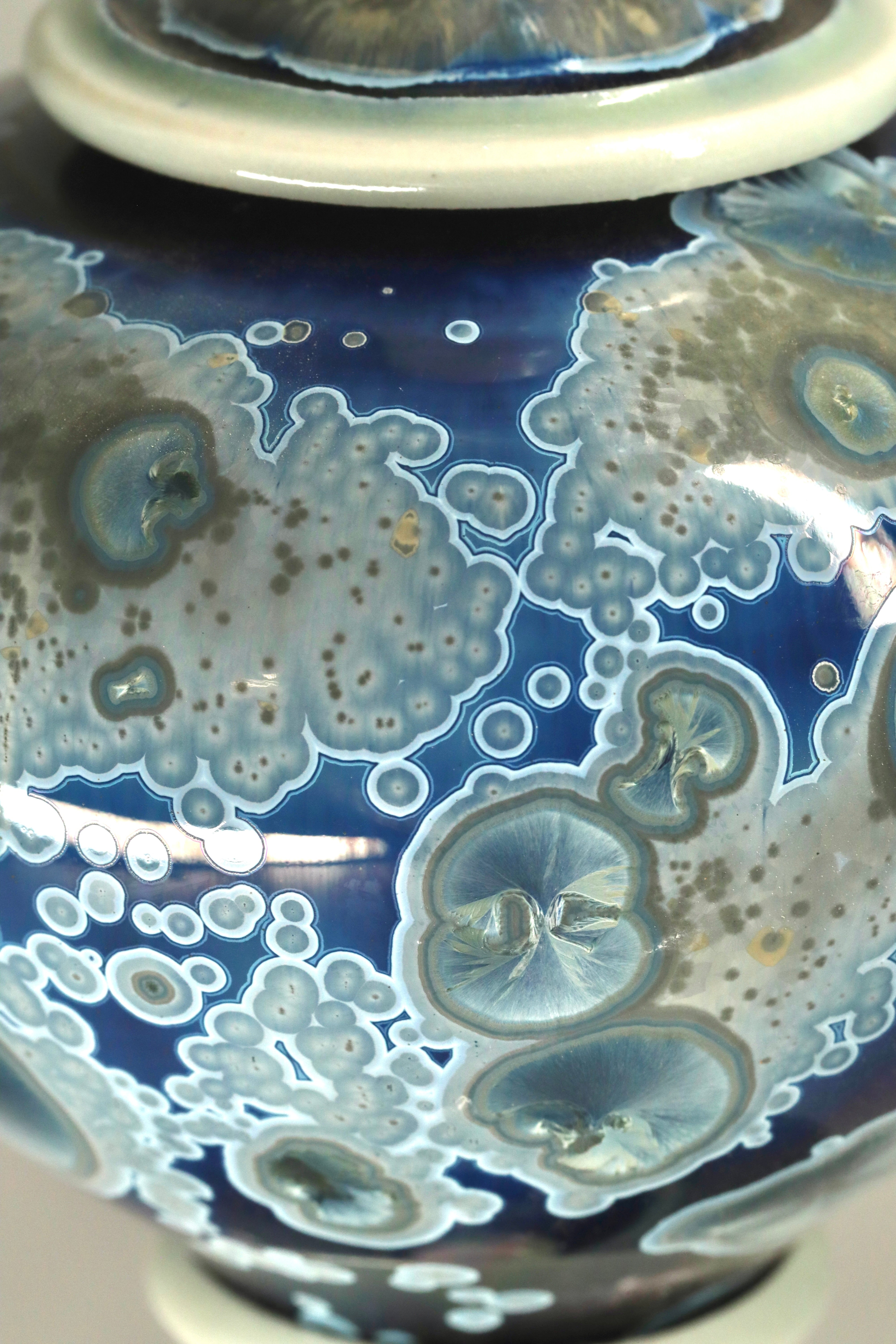 Every piece is thrown and trimmed on the wheel using Coleman porcelain. This jar was fired in an oxidation atmosphere in an electric kiln.  Crystal glazes are fired to cone 10 (2350° F) until they turn molten and begin to run down the surface of the pot.  The temperature is then cooled, stopping the glaze from running, and causing crystals to grow.