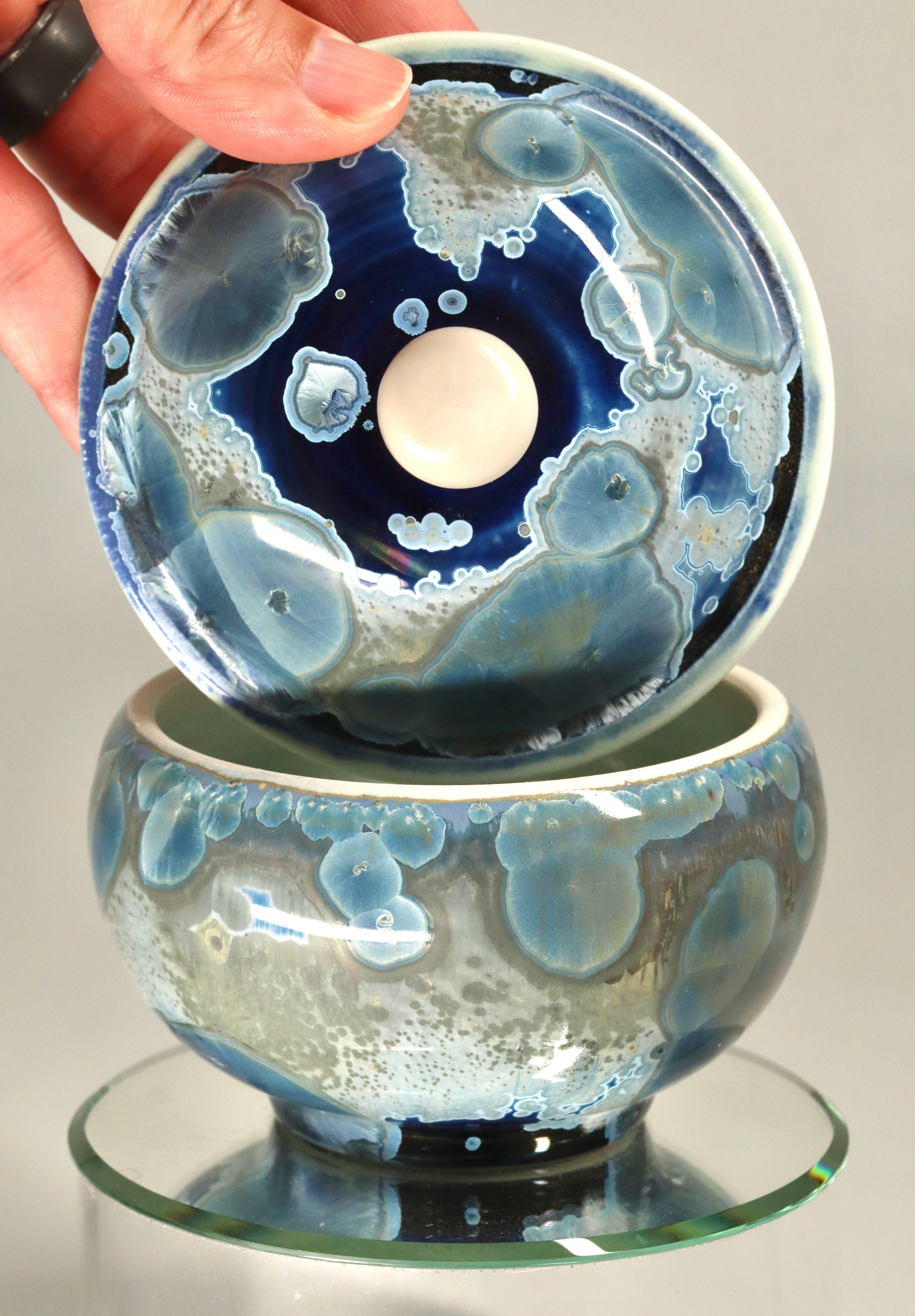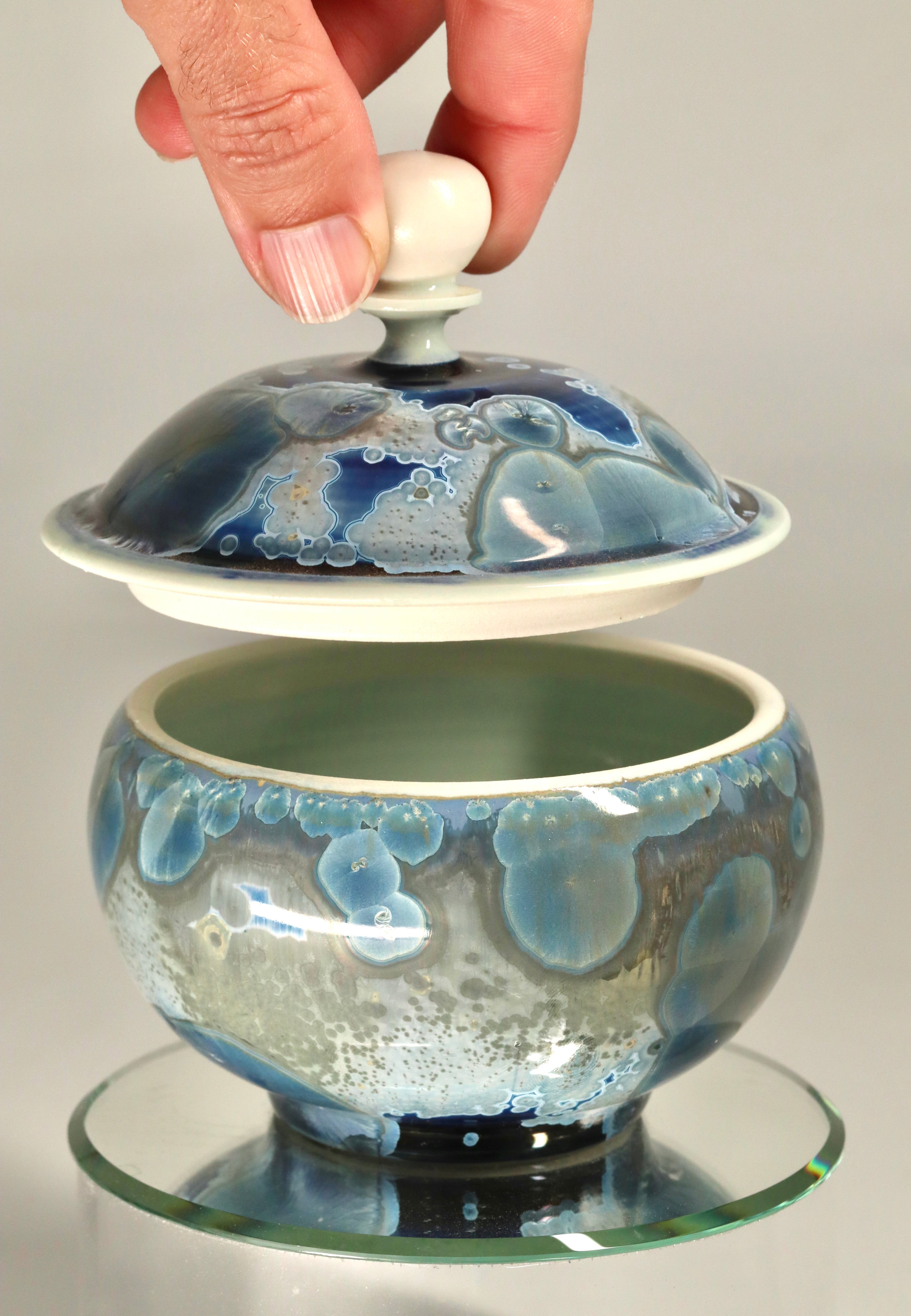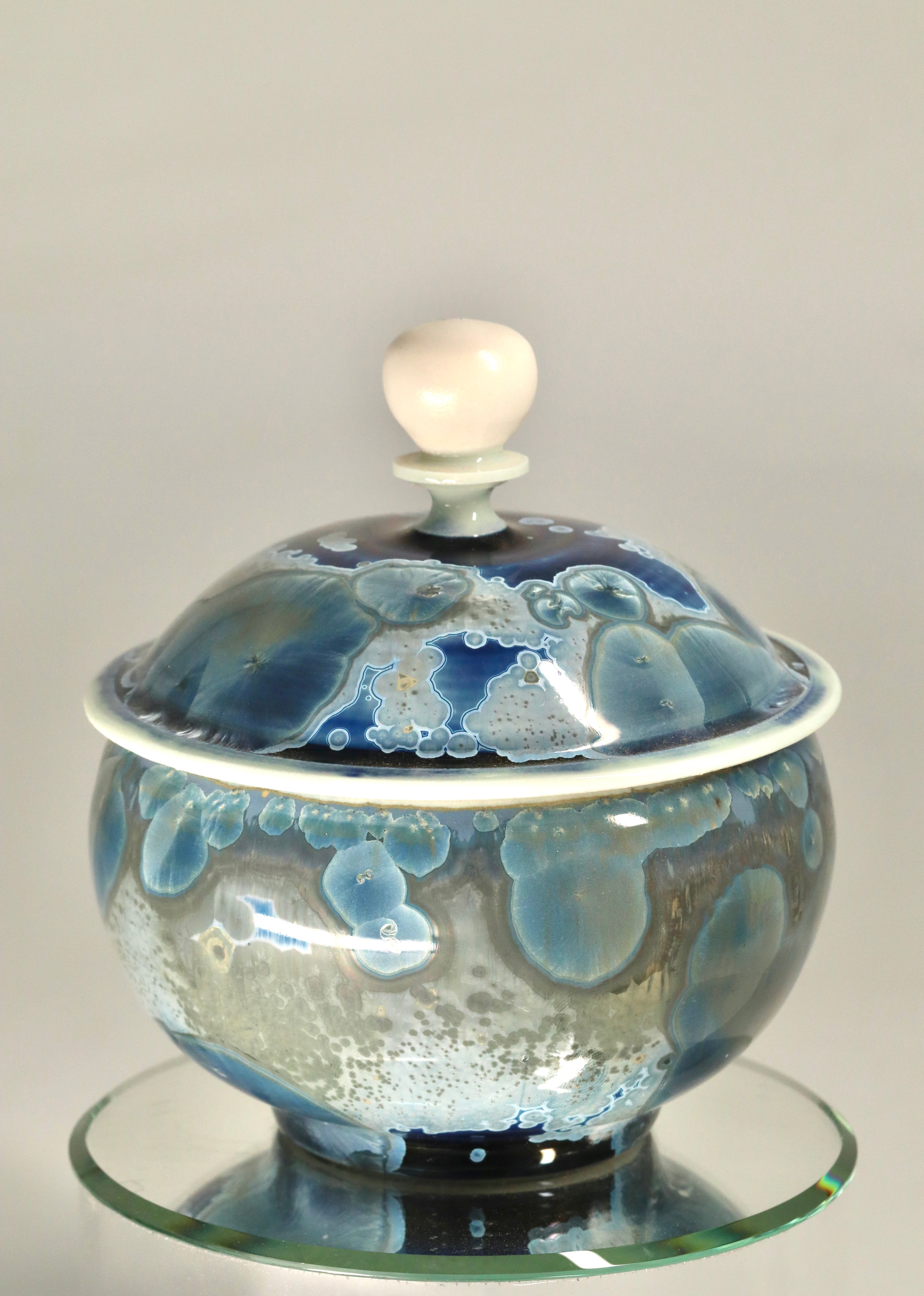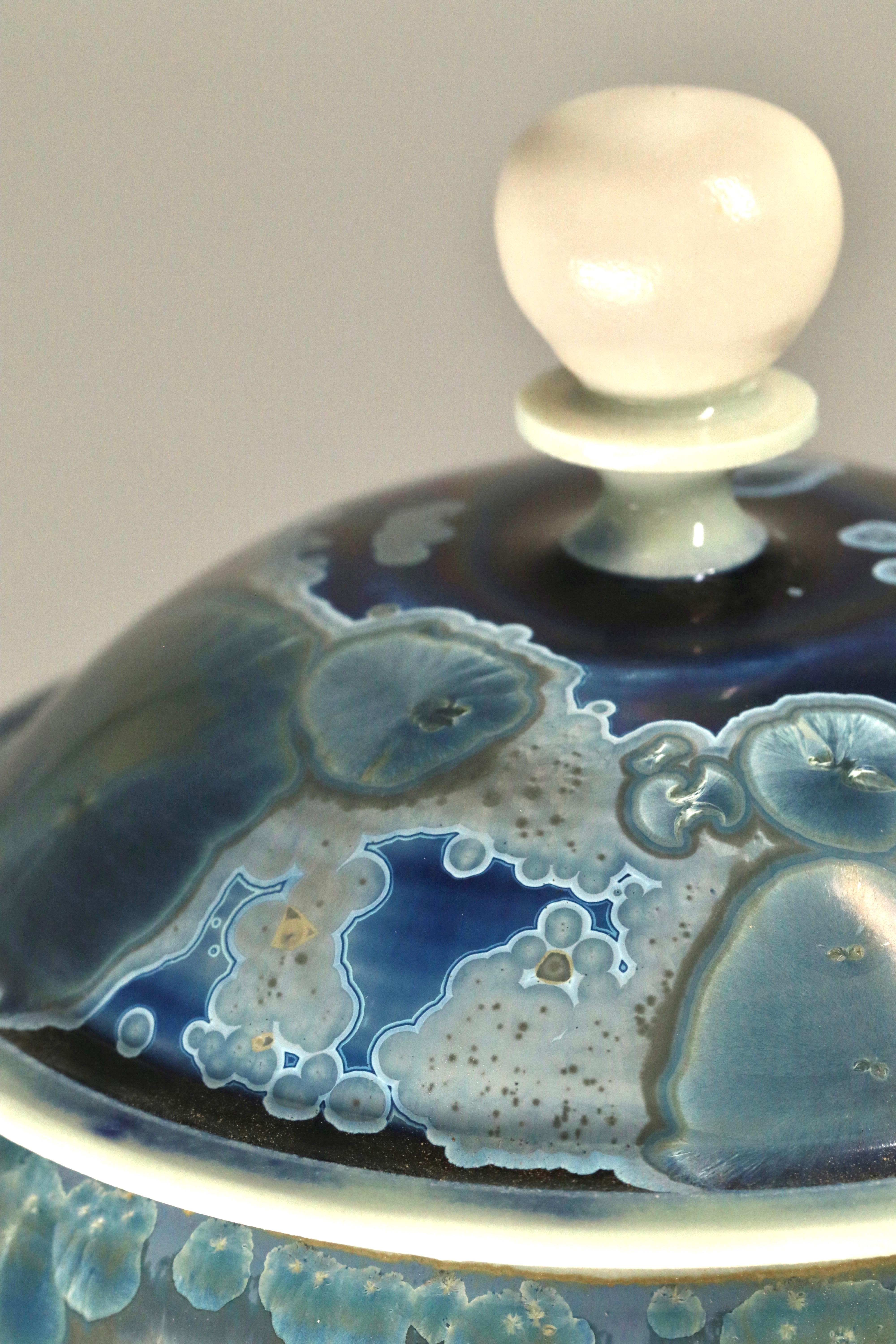 Every piece is thrown and trimmed on the wheel using Coleman porcelain. This jar was fired in an oxidation atmosphere in an electric kiln.  Crystal glazes are fired to cone 10 (2350° F) until they turn molten and begin to run down the surface of the pot.  The temperature is then cooled, stopping the glaze from running, and causing crystals to grow.
