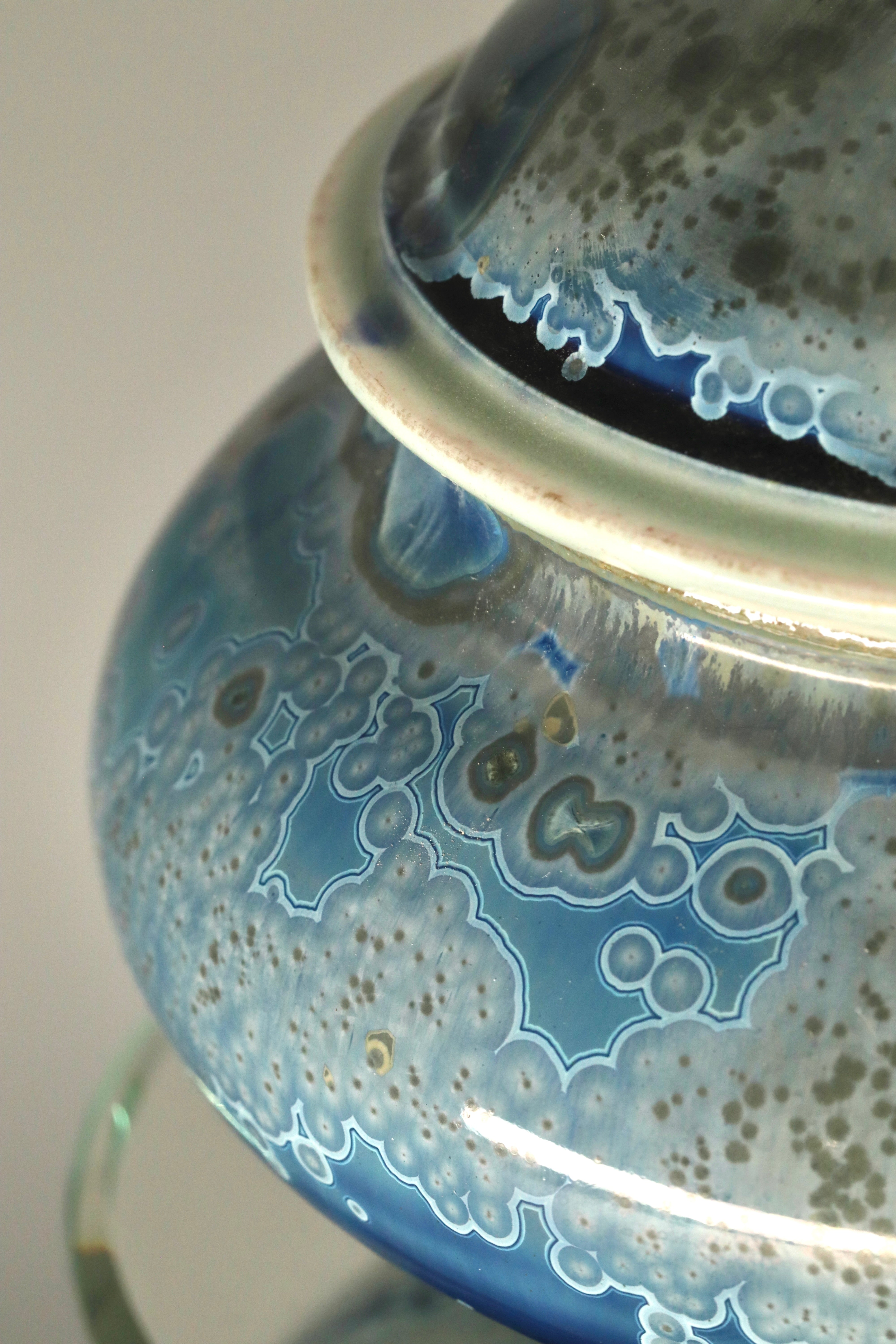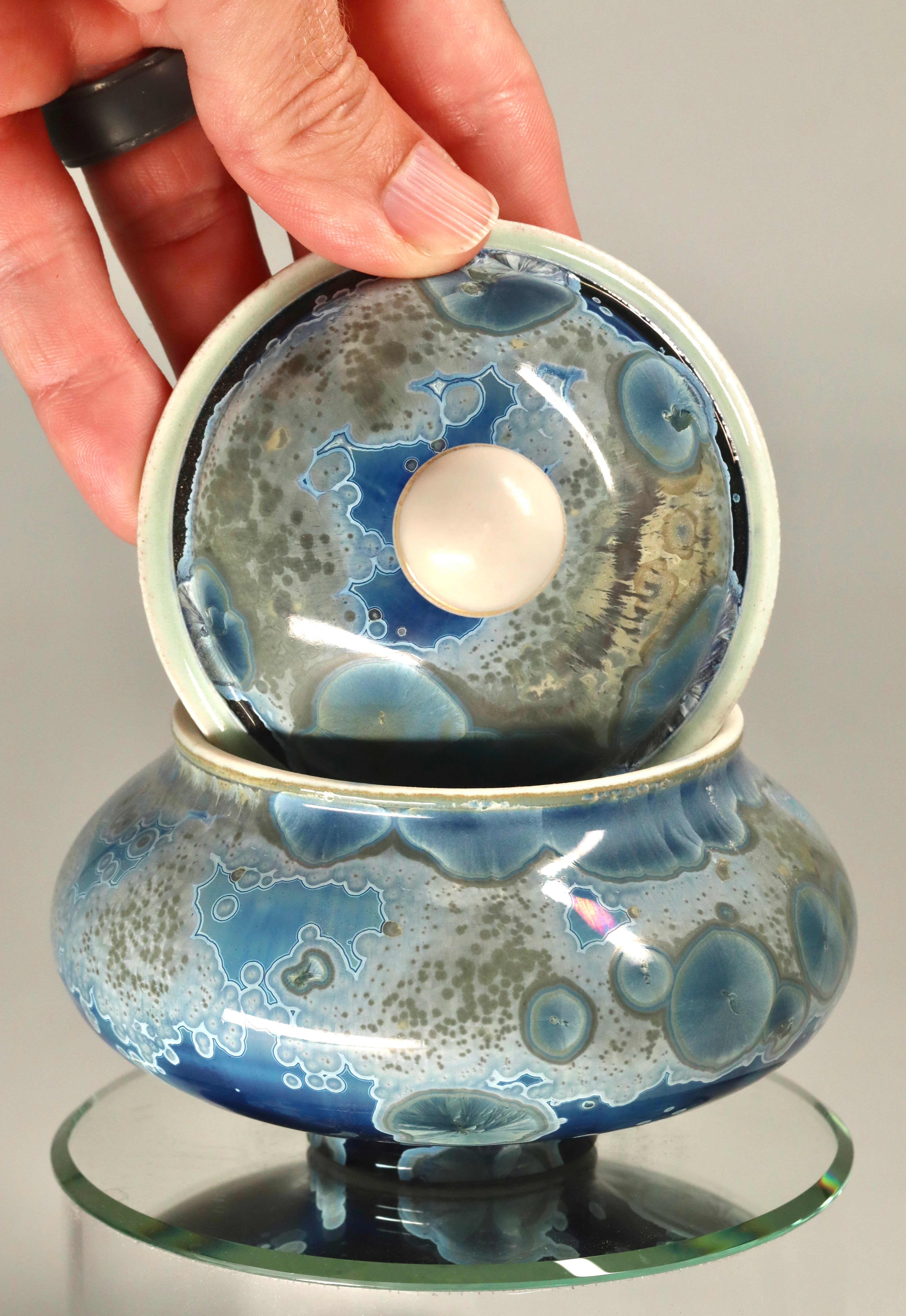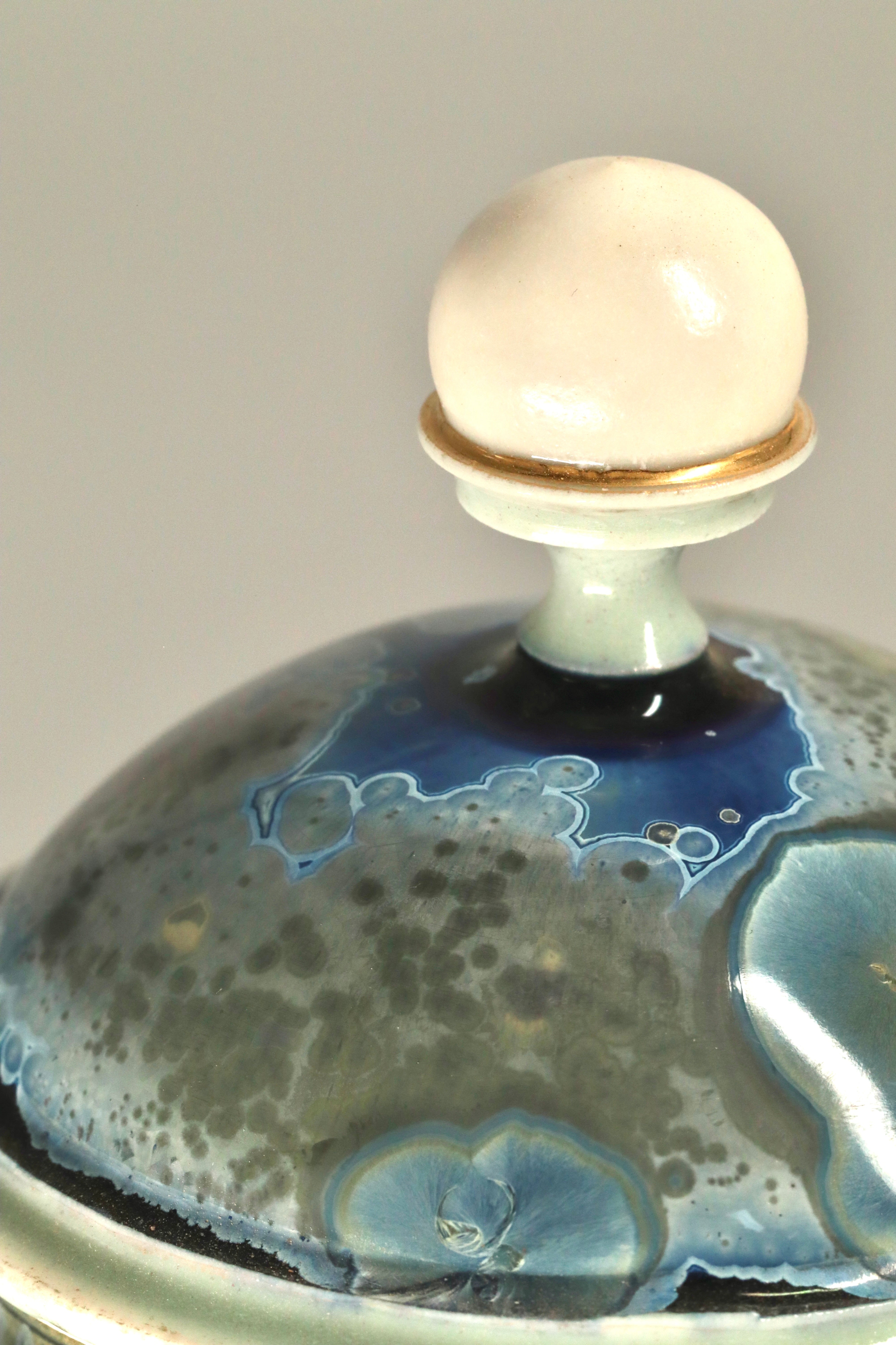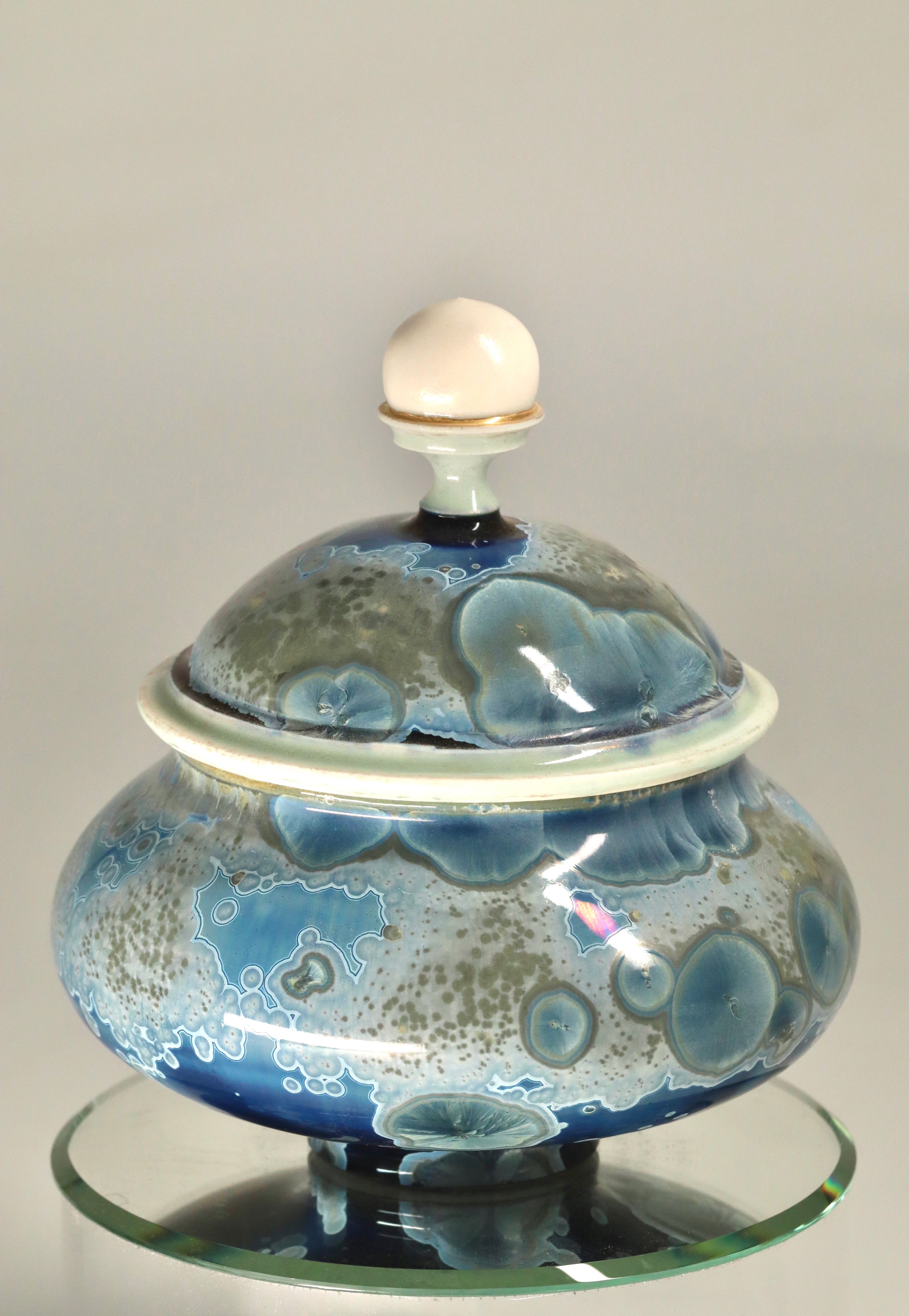 Every piece is thrown and trimmed on the wheel using Coleman porcelain. This jar was fired in an oxidation atmosphere in an electric kiln. Crystal glazes are fired to cone 10 (2350° F) until they turn molten and begin to run down the surface of the pot. The temperature is then cooled, stopping the glaze from running, and causing crystals to grow.