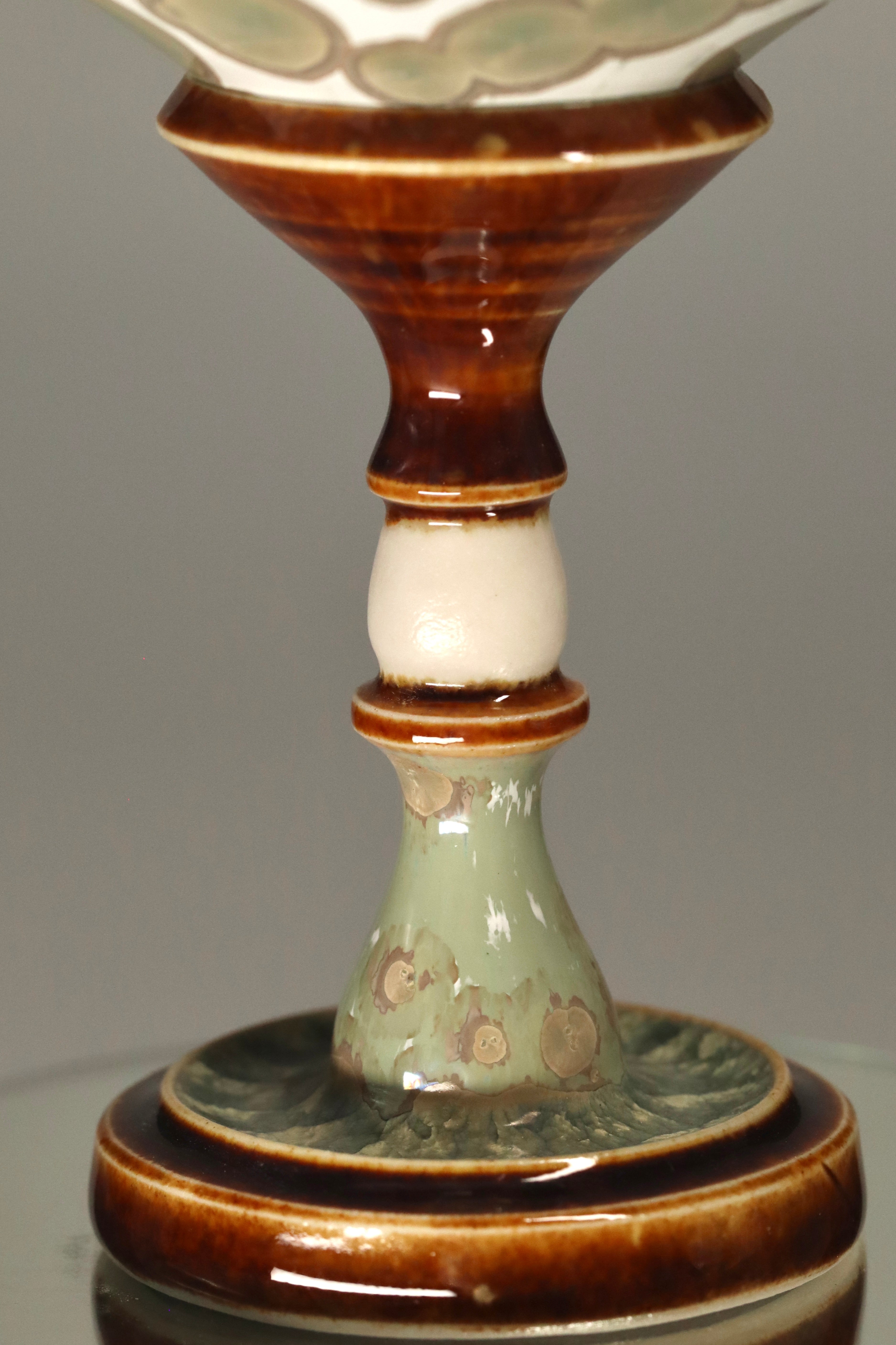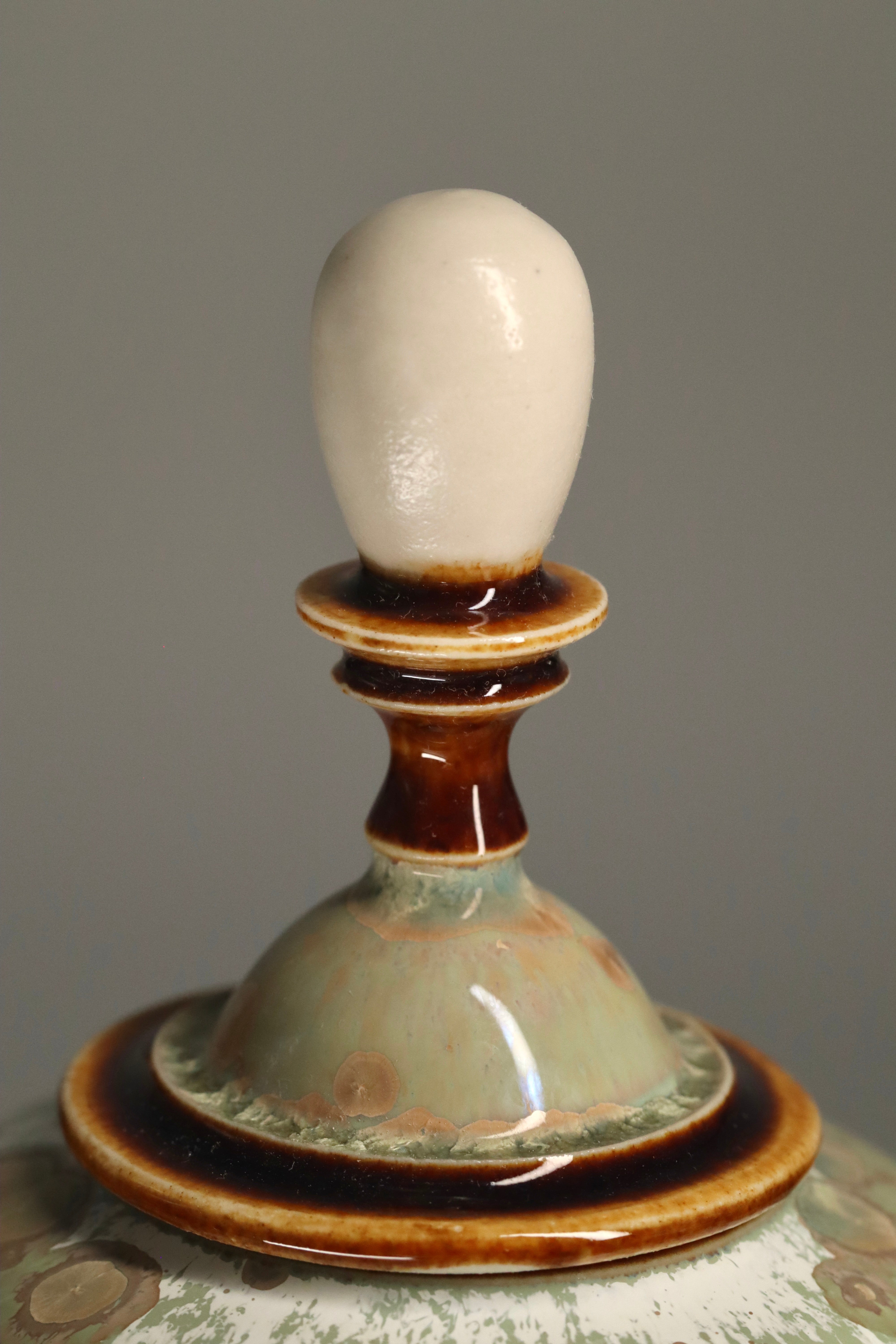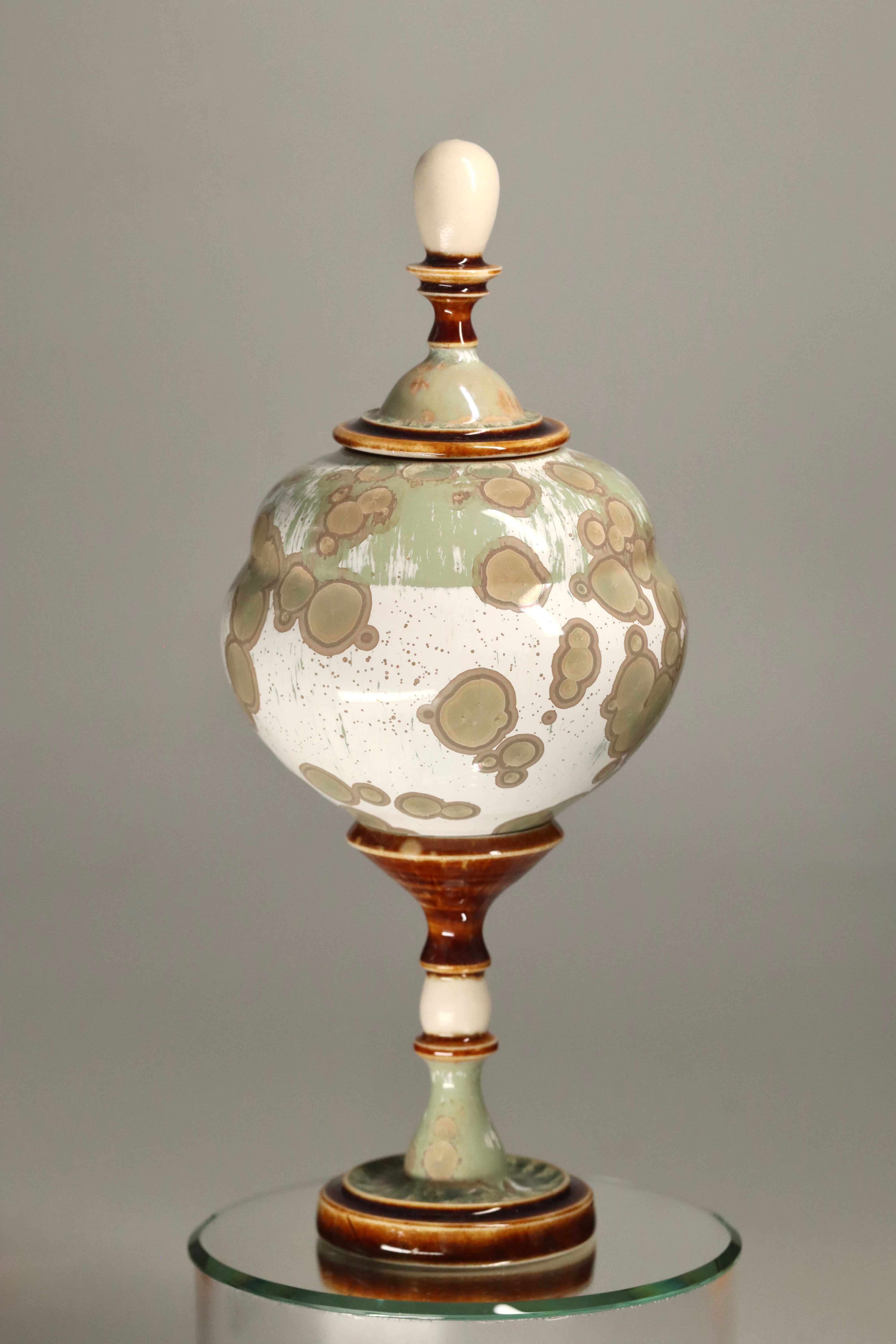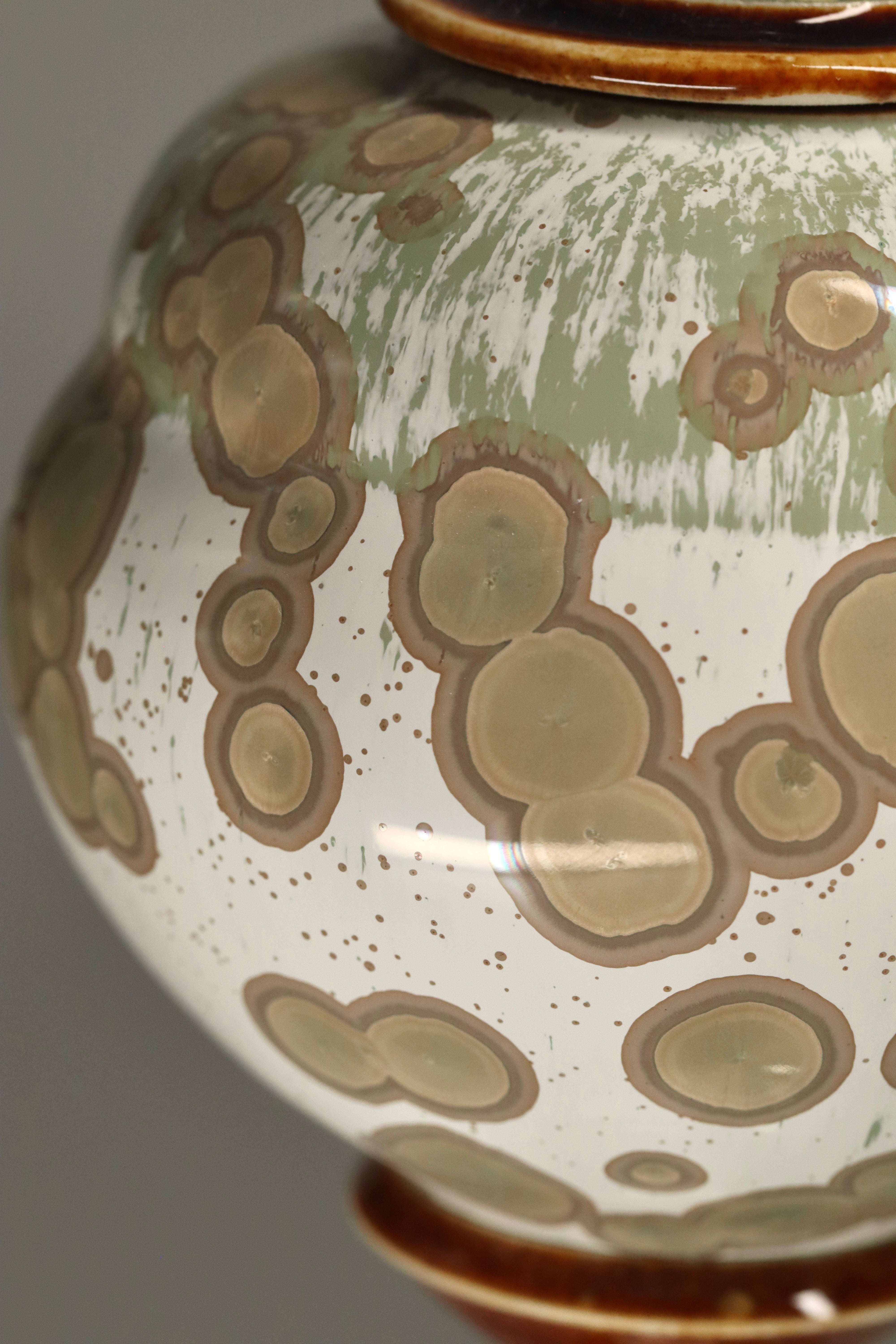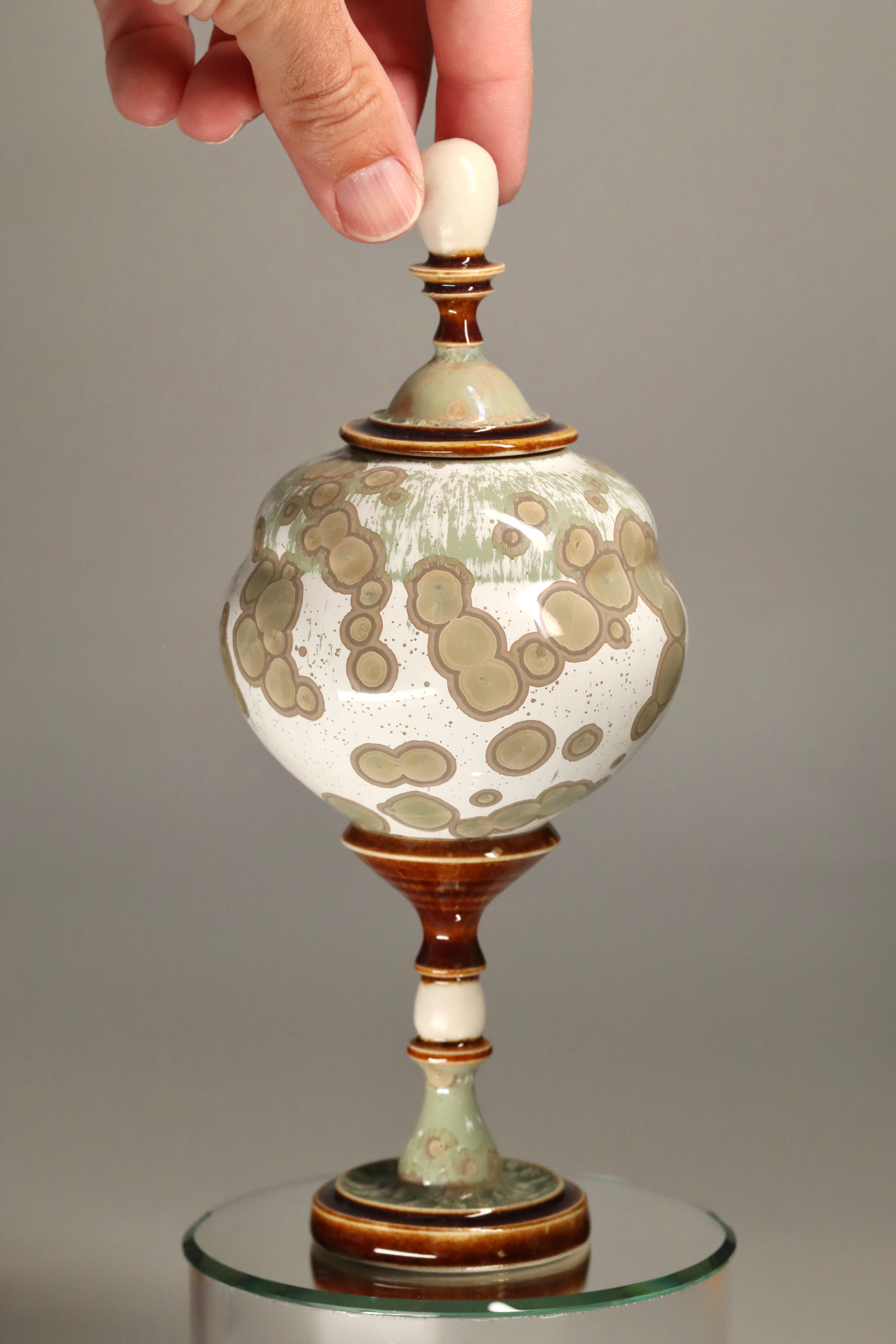Every piece is thrown and trimmed on the wheel using Coleman porcelain. This jar was fired in an oxidation atmosphere in an electric kiln. Crystal glazes are fired to cone 10 (2350° F) until they turn molten and begin to run down the surface of the pot. The temperature is then cooled, stopping the glaze from running, and causing crystals to grow.