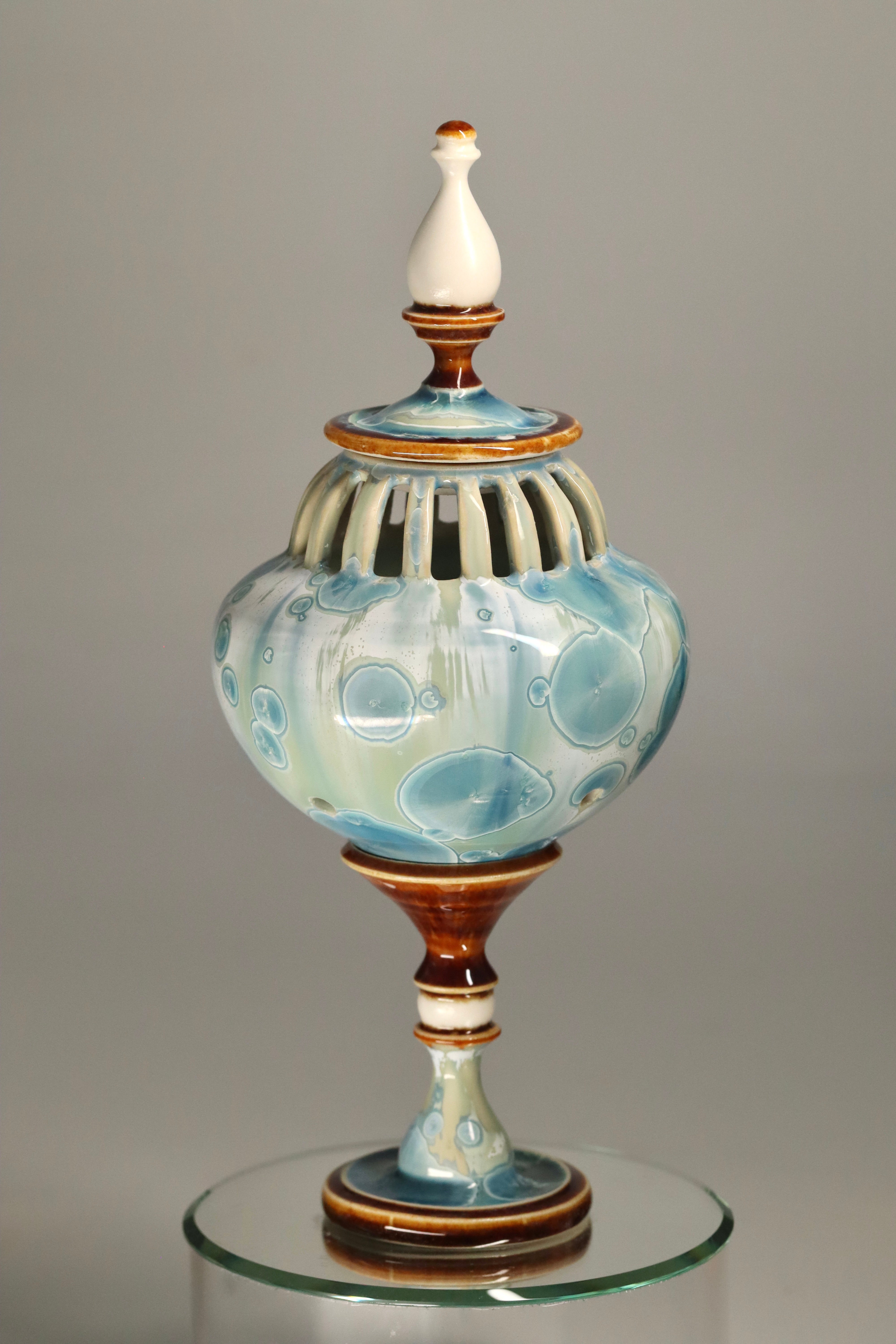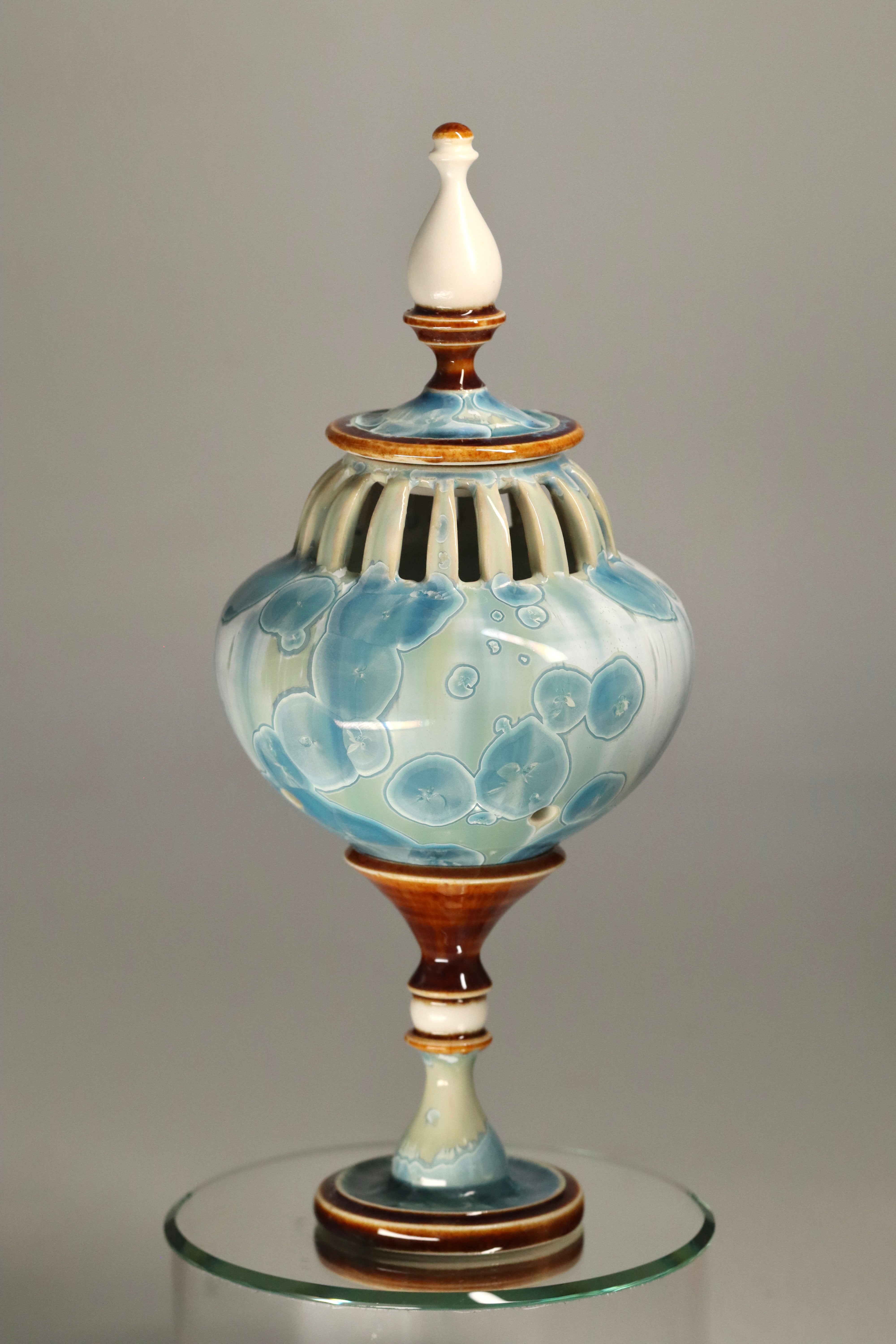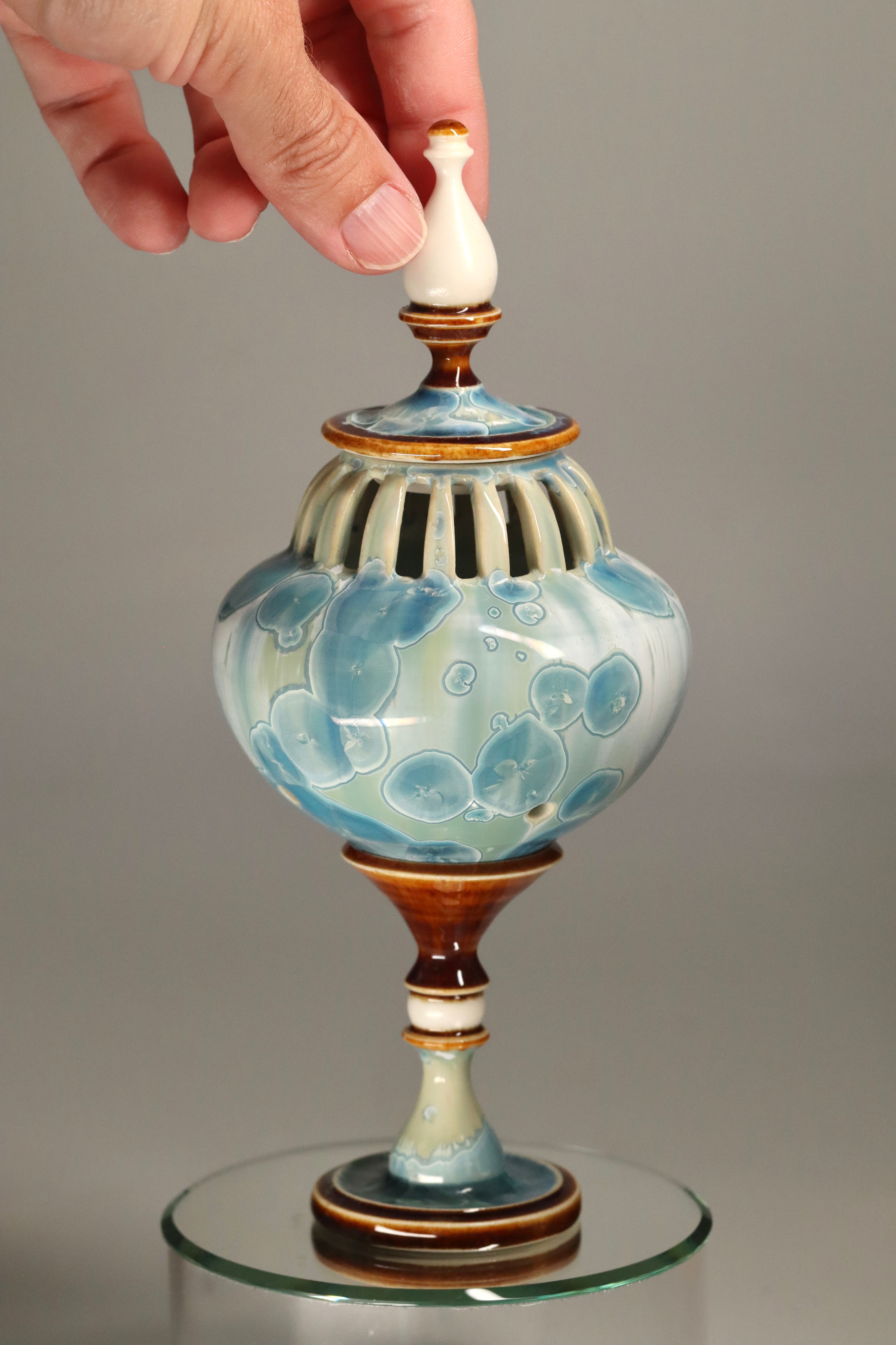 Porcelain, hand-thrown incense burner with a blue/green "Seafoam" glaze. This jar has been "etched" in sodium bisulfate to lighten the crystals.