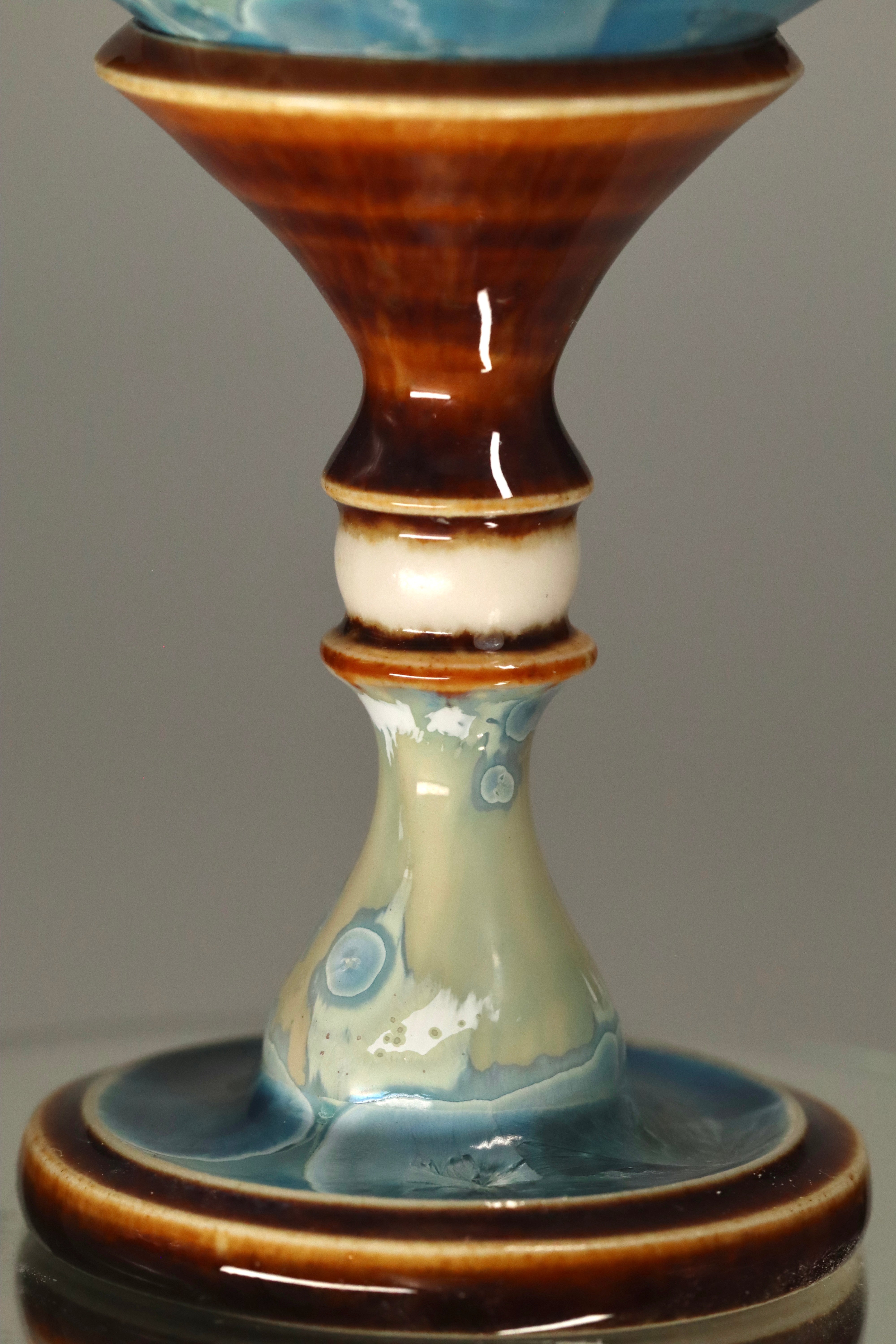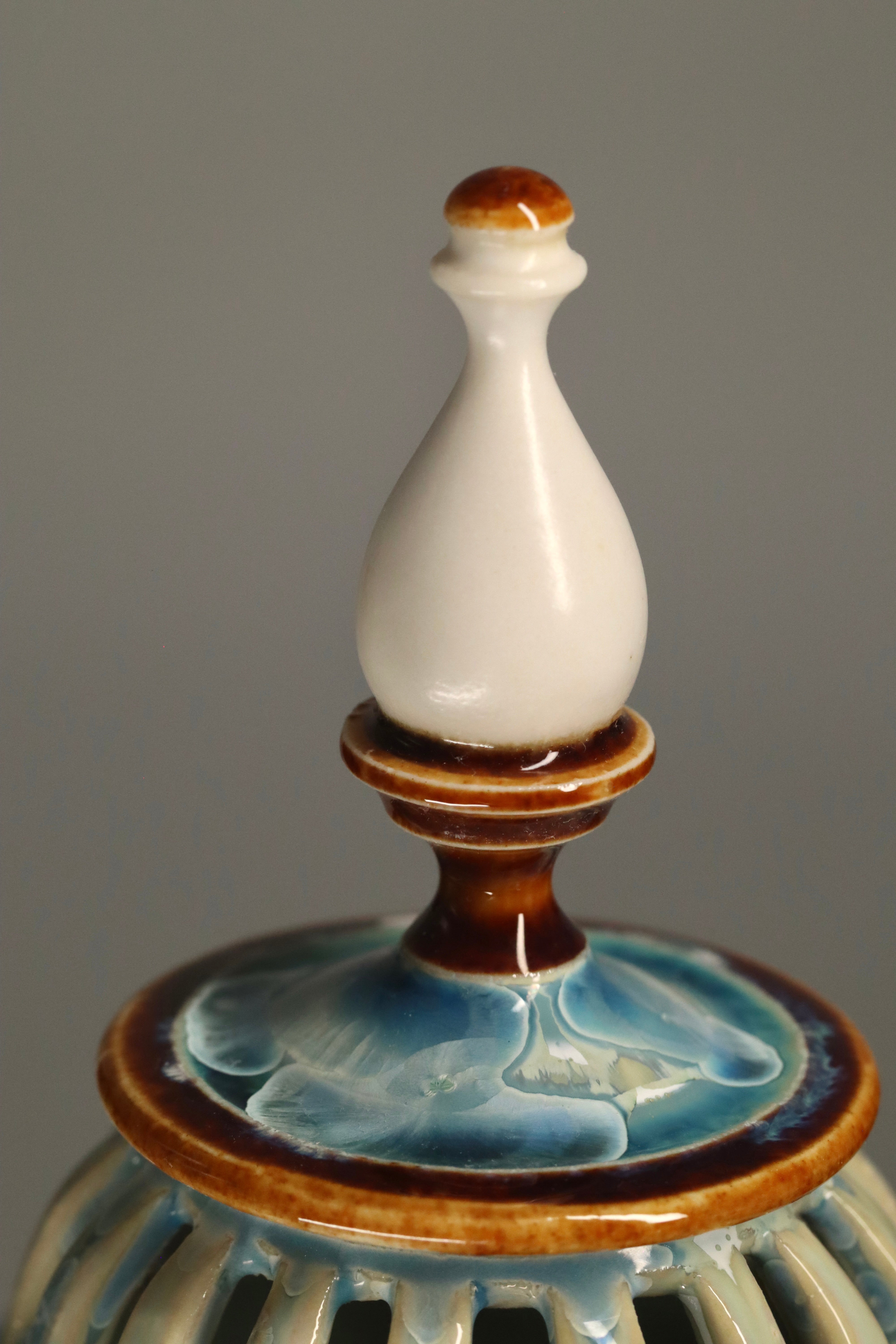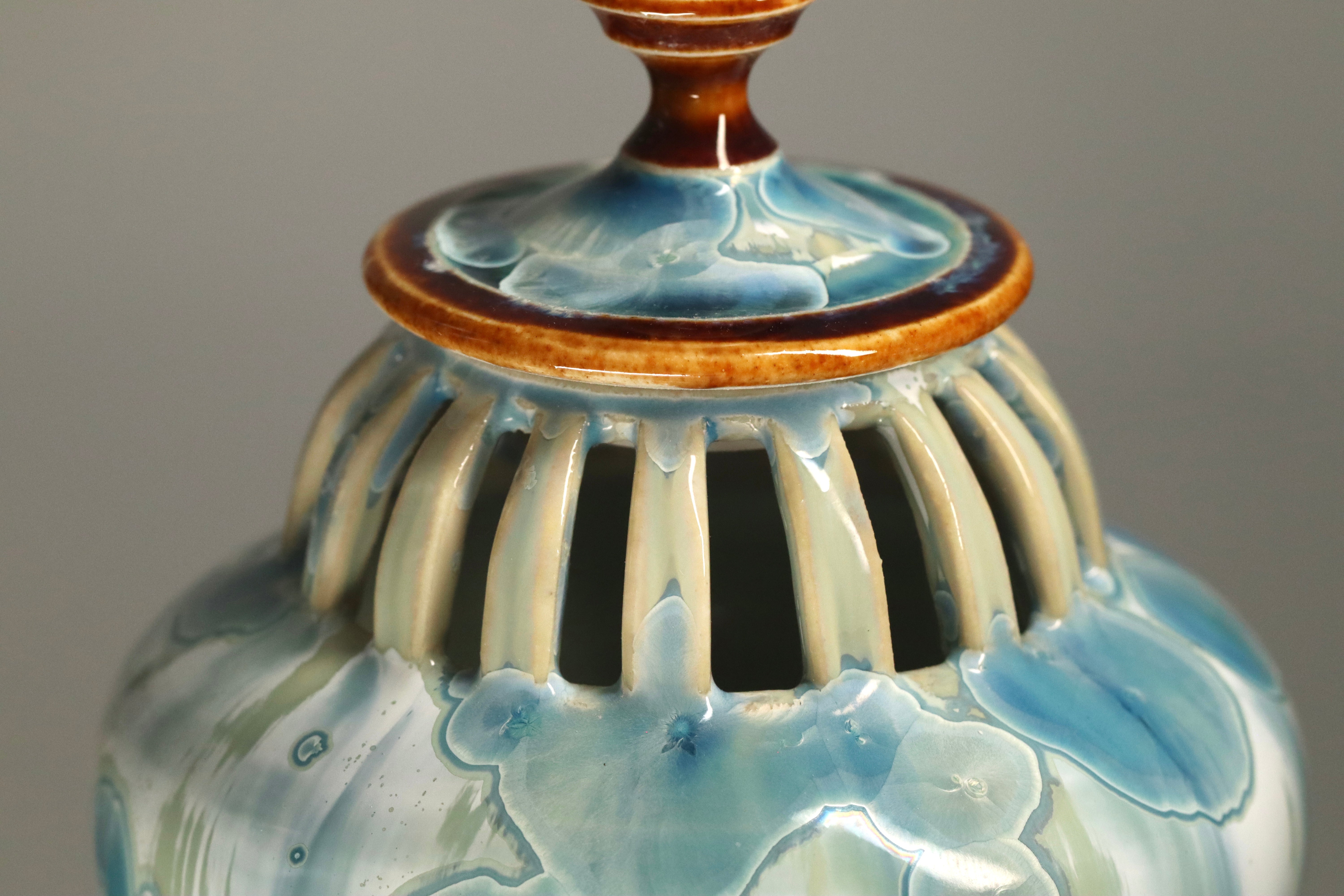 Porcelain, hand-thrown incense burner with a blue/green "Seafoam" glaze. This jar has been "etched" in sodium bisulfate to lighten the crystals.